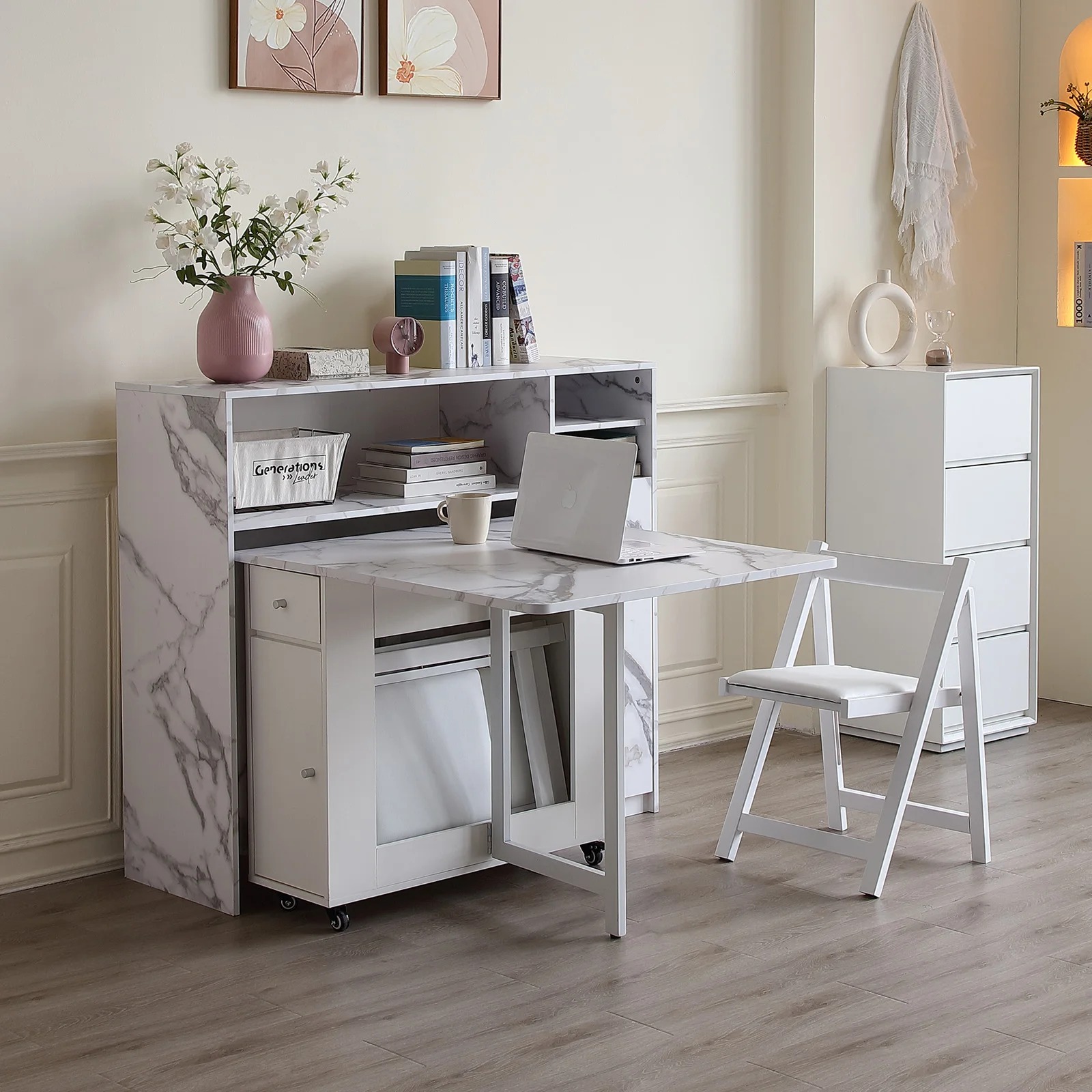 Bàn đảo bếp thông minh có thể biến đổi thành bàn ăn cho 4 người. Sản phẩm có thiết kế gấp gọn độc đáo với mặt bàn mở rộng, tích hợp kệ lưu trữ và có thể đóng vai trò là bàn làm việc, học tập khi cần thiết.