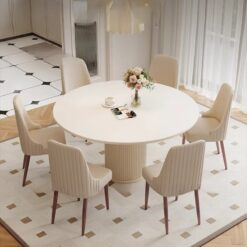 Bàn tròn gỗ Oak với thiết kế chân hình sóng độc đáo, tạo điểm nhấn thẩm mỹ tinh tế. Sản phẩm có mặt bàn tròn màu trắng kem sang trọng, chân có cấu trúc rãnh dọc uốn lượn như sóng nước, mang đến vẻ đẹp hiện đại và ấm áp cho không gian phòng ăn.