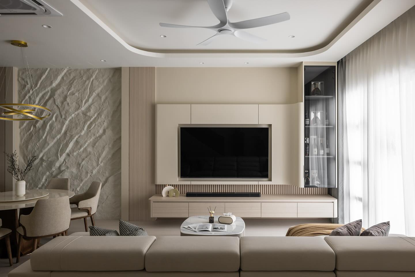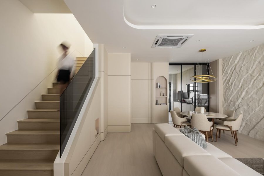 - Gam màu chủ đạo: Trắng kem, Be, Xám – tạo không gian thoáng đãng, sang trọng