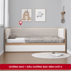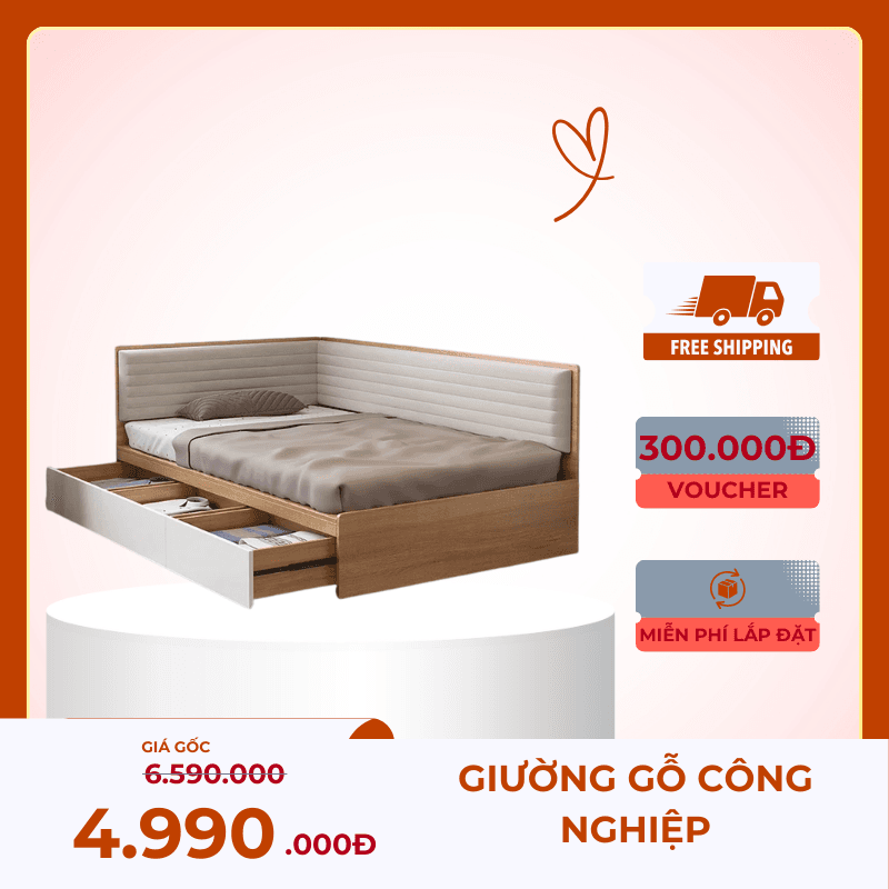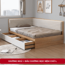 Giường ngủ thiết kế góc L đặc biệt với ghế sofa tích hợp, kết hợp ngăn kéo lưu trữ thông minh dưới gầm giường. Chất liệu MDF 9mm & 17mm chống ẩm cao cấp, bề mặt phủ melamine bền màu. Sản phẩm có cấu trúc đầu giường hình chữ L tạo không gian ngồi lựa, màu nâu gỗ ấm áp kết hợp trắng hiện đại. Nhiều kích thước, giá từ 4.990.000đ. Miễn phí thiết kế 3D, giao lắp tận nơi TPHCM.