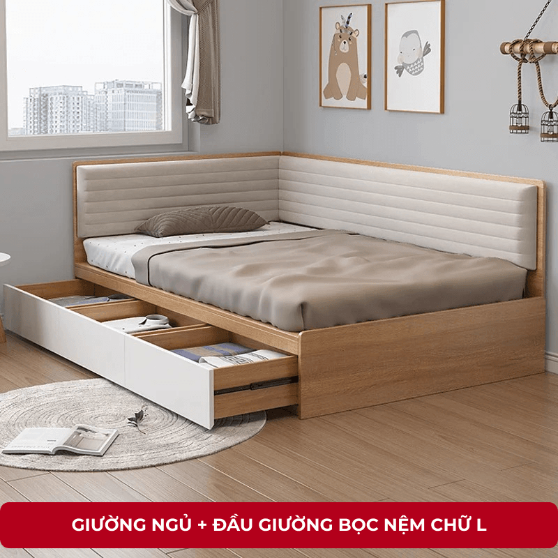 Giường gỗ công nghiệp có ngăn kéo lưu trữ góc L là sản phẩm nội thất thông minh, kết hợp hoàn hảo giữa giường ngủ và không gian thư giãn. Điểm đặc biệt của sản phẩm là thiết kế đầu giường hình chữ L tạo thành góc sofa tích hợp, vừa là nơi tựa lưng thoải mái, vừa là góc ngồi đọc sách hay thư giãn ban ngày.
