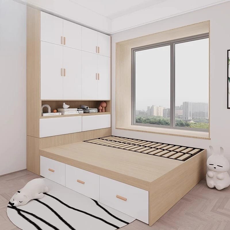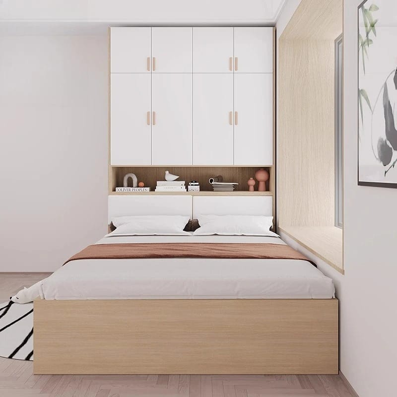 Combo giường tủ tích hợp tủ áo 2 cánh cao sát trần và giường có 3 ngăn kéo lưu trữ. Chất liệu MDF 9mm & 17mm chống ẩm, màu be kem kết hợp trắng nhẹ nhàng, phong cách Nhật Bản tối giản. Thiết kế thông minh tối ưu không gian phòng nhỏ 10-15m². Tủ cao tận dụng trần nhà, giường ngang có kệ trang trí 2 bên. Giá từ 19.900.000đ. Miễn phí thiết kế 3D, giao lắp TPHCM.