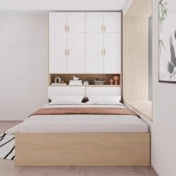 Giường gỗ công nghiệp kèm tủ áo tích hợp COMBO02 là giải pháp nội thất 2 trong 1 hoàn hảo cho phòng ngủ nhỏ 10-15m². Thiết kế tối giản theo phong cách Nhật Bản với tone màu be kem – trắng kem nhẹ nhàng, tạo không gian thư giãn, ấm cúng và thoáng đãng.