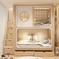 Giường tầng thiết kế ngôi nhà độc đáo với cửa sổ tròn, bậc thang an toàn và 2 ngăn kéo lưu trữ. Chất liệu gỗ MDF 9mm & 17mm màu vân gỗ sồi tự nhiên. Kệ trang trí tích hợp, phù hợp phòng trẻ em 15-20m².