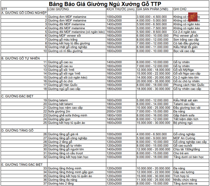 PHẦN 2: BẢNG GIÁ GIƯỜNG NGỦ THEO CHẤT LIỆU 2025
