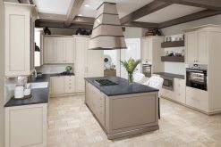 Tủ bếp gỗ công nghiệp MDF màu trắng tinh tế, phong cách Châu Âu sang trọng. Tủ trên có cánh kính, tủ dưới nhiều ngăn lưu trữ. Kết hợp bàn đảo bếp đa năng. Chống ẩm tốt, bền đẹp.