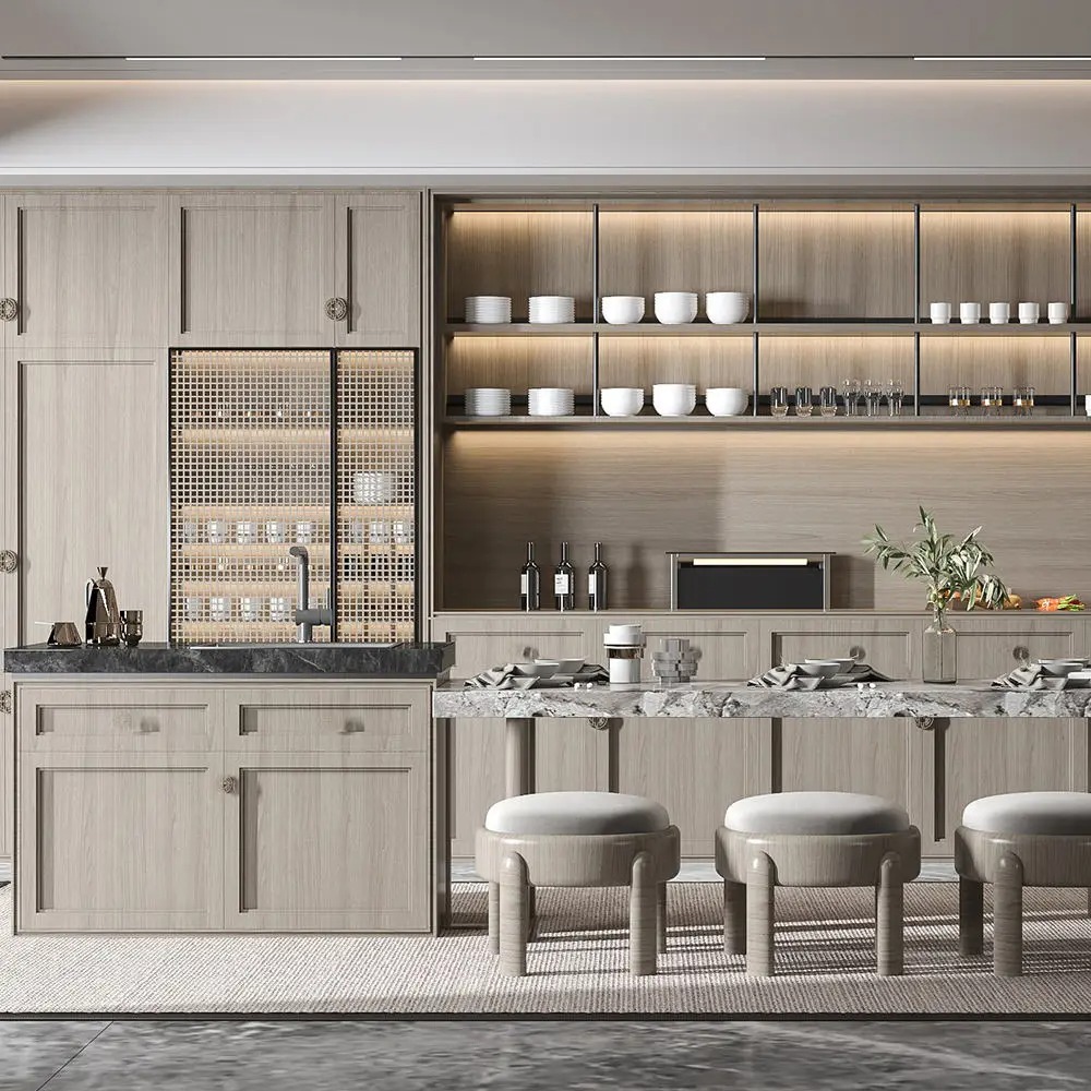 Điểm nhấn đặc biệt là tủ trên có cánh kính/lưới kim loại kết hợp đèn LED chiếu sáng bên trong, giúp trưng bày đồ dùng đẹp mắt và dễ quan sát. Tủ dưới thiết kế nhiều ngăn kéo và cánh tủ lưu trữ tiện lợi với màu be xám nhẹ nhàng, thanh lịch.