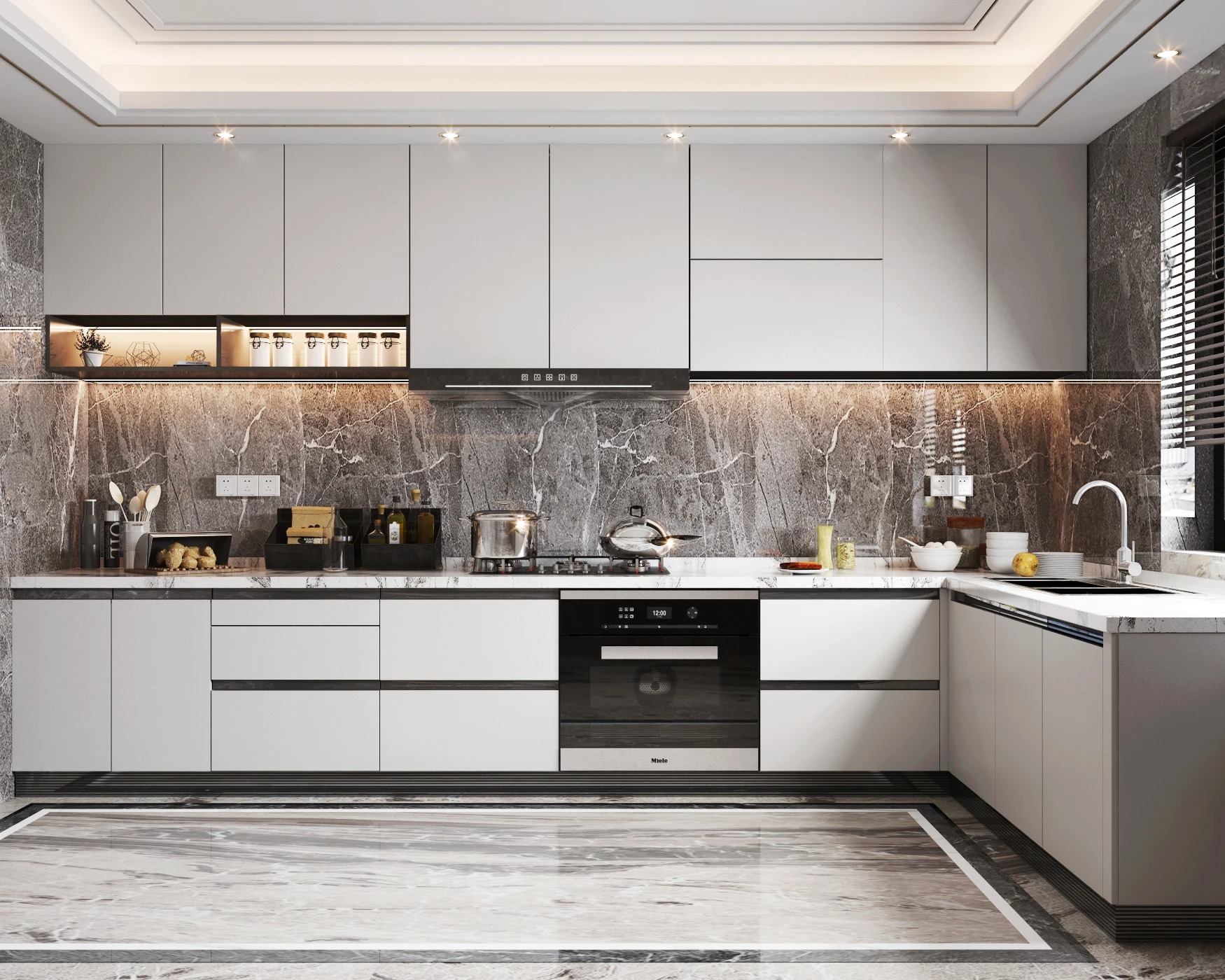 Tủ bếp hiện đại TBHD001 thiết kế tối giản, cánh tủ acrylic trắng viền đen sang trọng. Đá ốp tường vân đá tự nhiên màu xám. Tủ trên và tủ dưới với hệ thống đèn LED âm tủ. Chất liệu MDF 17mm chống ẩm, phụ kiện Blum/DTC. Mặt đá nhân tạo hoặc đá tự nhiên. Thiết kế chữ L/chữ I. Bảo hành 24 tháng. Xưởng Gỗ TTP – 0904233316.