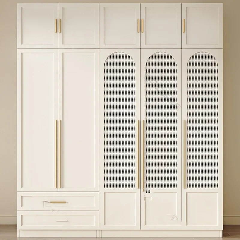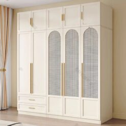 - 5 cánh tủ đa dạng: 3 cánh lưới mây rattan + 2 cánh gỗ phào nổi